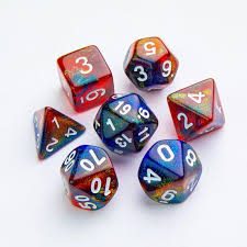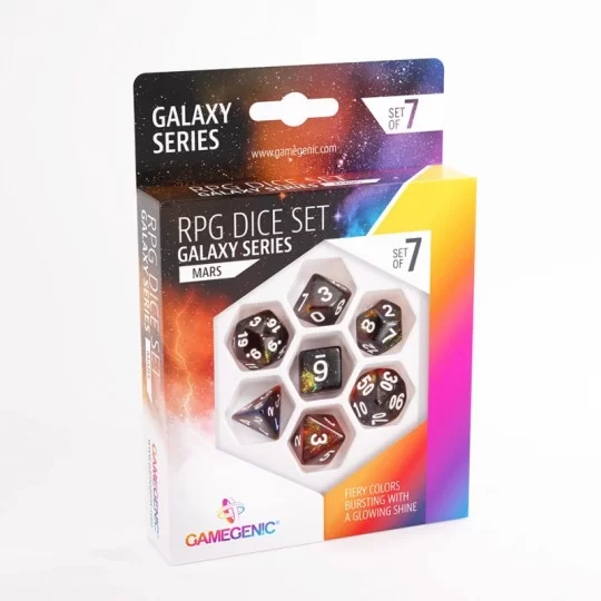 Set de 7 dés de la marque Gamegenic dans une boite. Contient un D4, un D6, un D8, deux D10 (00 et 10), un D12 et un D20.
